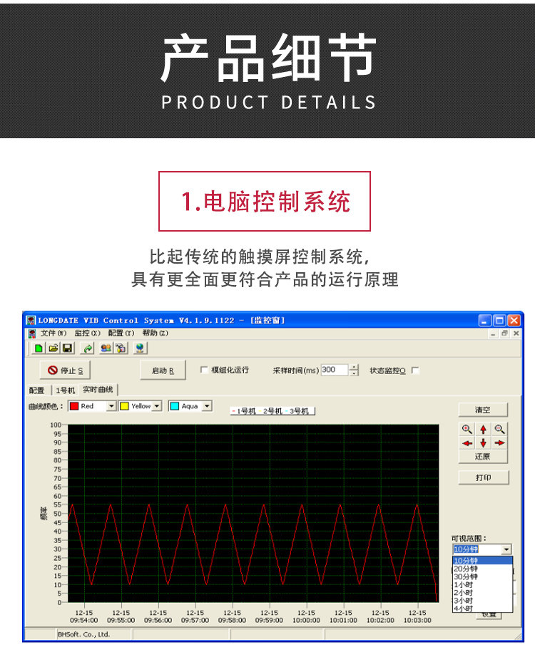 控制系统:7英寸/10英寸彩色触摸屏+PLC控制器,操作直观便捷;支持参数设定、时间控制、运行状态显示(振幅、时间、故障信息等);内置过载、过流保护程序。